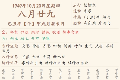 1949年10月20日黄历 时辰吉凶格局