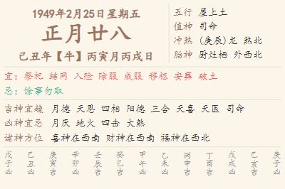 1949年2月25日黄历 时辰吉凶格局