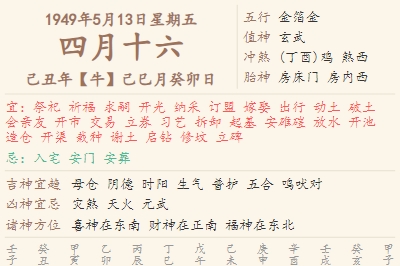 1949年5月13日黄历 时辰吉凶格局