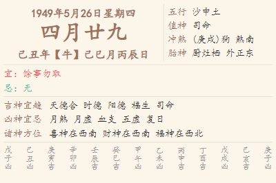 1949年5月26日黄历 时辰吉凶格局