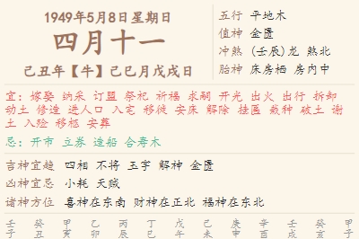 1949年5月8日黄历 时辰吉凶格局