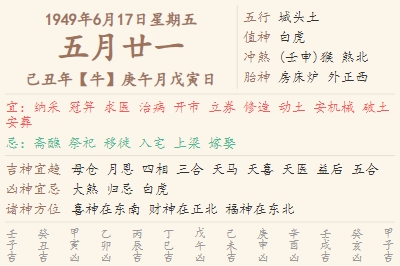 1949年6月17日黄历 时辰吉凶格局