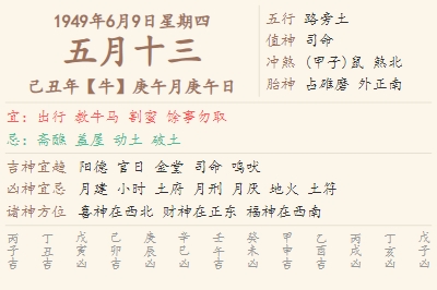 1949年6月9日黄历 时辰吉凶格局