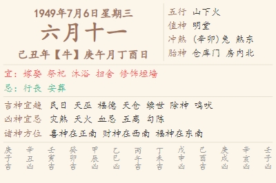 1949年7月6日黄历 时辰吉凶格局