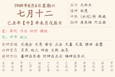1949年8月6日黄历 时辰吉凶格局