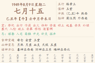 1949年8月9日黄历 时辰吉凶格局