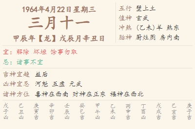 1964年4月22日黄历 时辰吉凶格局