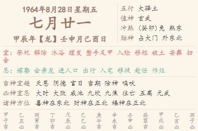1964年8月28日黄历 时辰吉凶格局