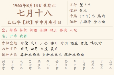 1965年8月14日黄历 时辰吉凶格局