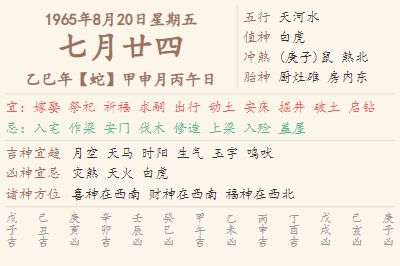 1965年8月20日黄历 时辰吉凶格局