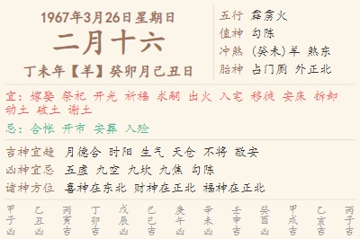 1967年3月26日黄历 时辰吉凶格局