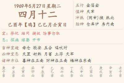 1969年5月27日黄历 时辰吉凶格局