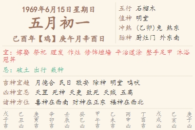 1969年6月15日黄历 时辰吉凶格局