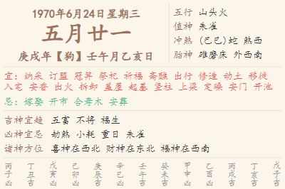 1970年6月24日黄历 时辰吉凶格局