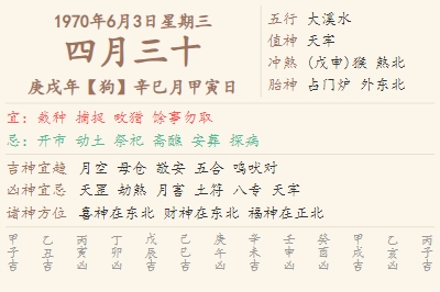 1970年6月3日黄历 时辰吉凶格局