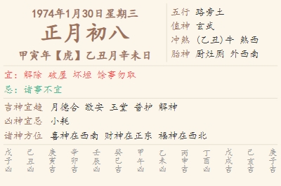 1974年1月30日黄历 时辰吉凶格局