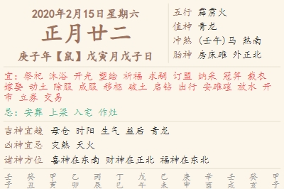 2020年2月15日黄历 时辰吉凶格局
